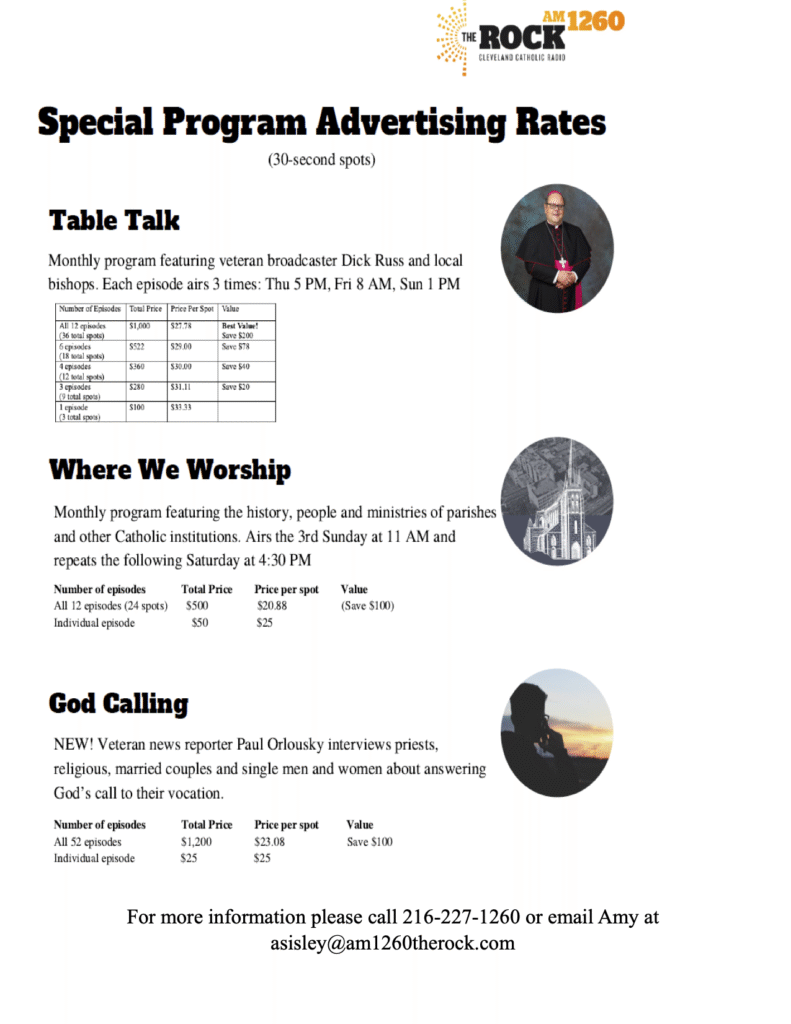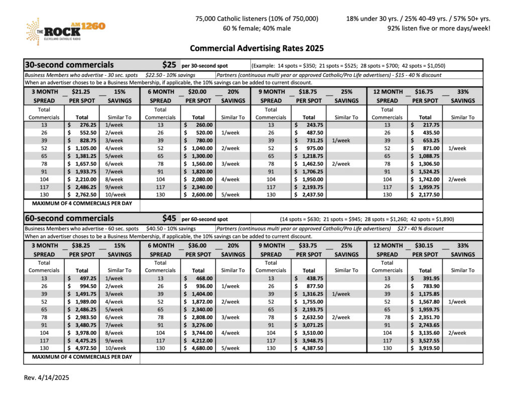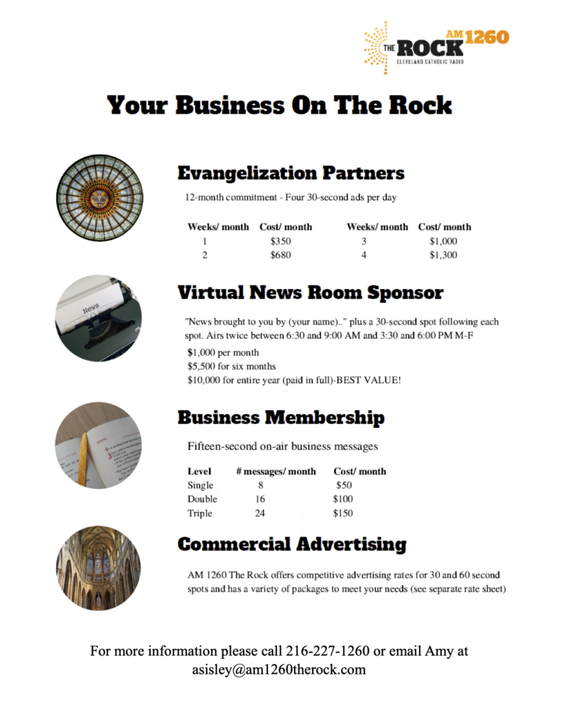 Let the community know that you support Catholic Radio in Cleveland by becoming a Business Member or Advertiser with AM 1260 The Rock! Listeners are a truly responsive and loyal audience who choose to support and frequent the businesses that support AM 1260 The Rock.