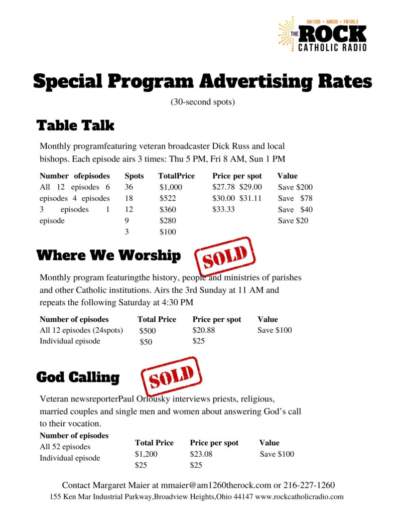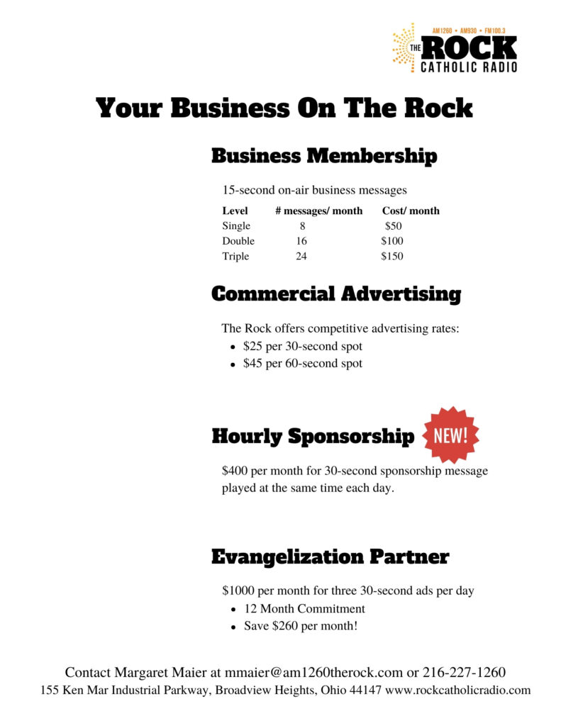 Let the community know that you support Catholic Radio in Cleveland by becoming a Business Member or Advertiser with The Rock Catholic Radio! Listeners are a truly responsive and loyal audience who choose to support and frequent the businesses that support The Rock Catholic Radio.