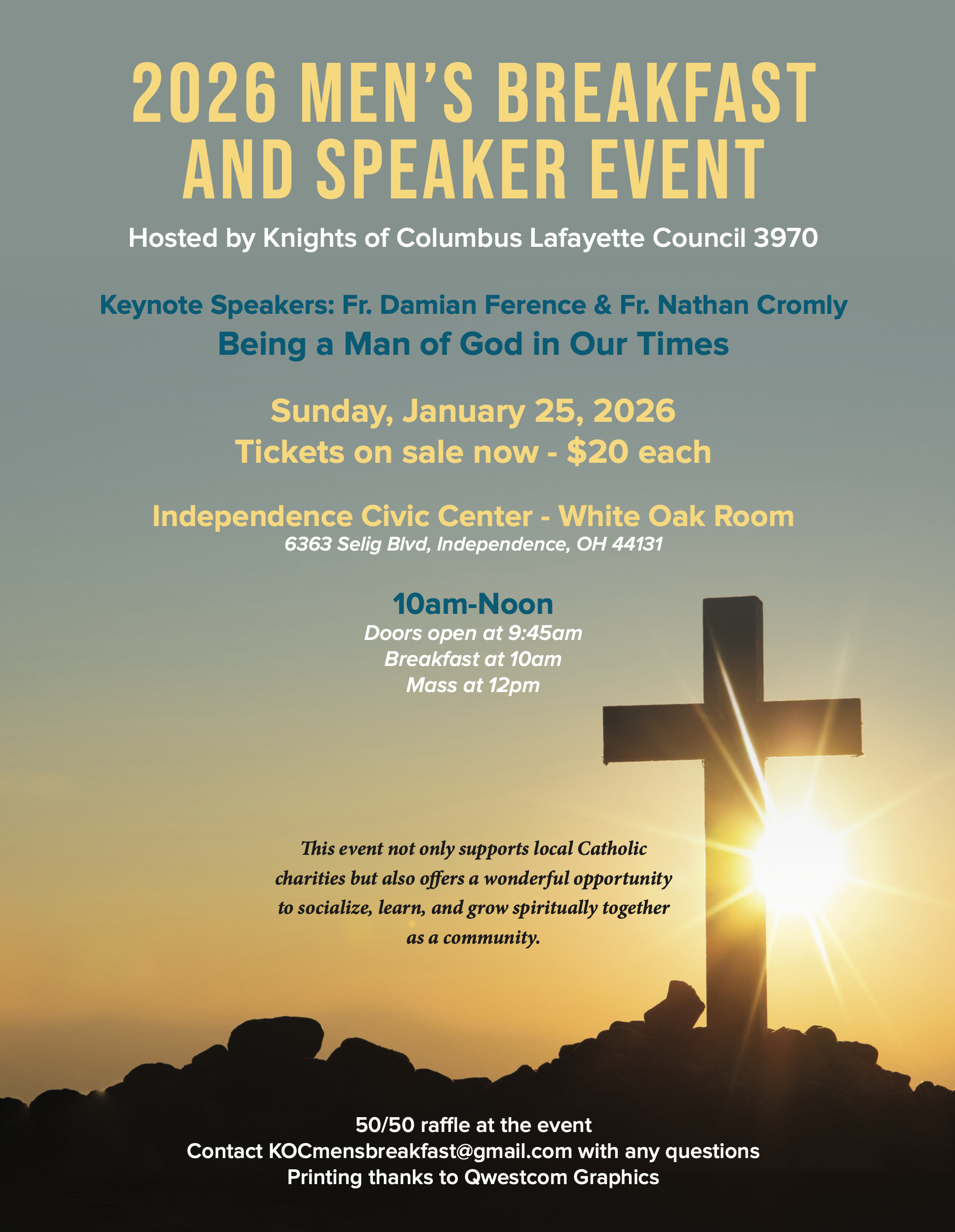 The Knights of Columbus Lafayette Council is hosting a Mens Breakfast at the Independence Civic Center on January 25th. Door’s open and 9:45 and breakfast will be served at 10:00