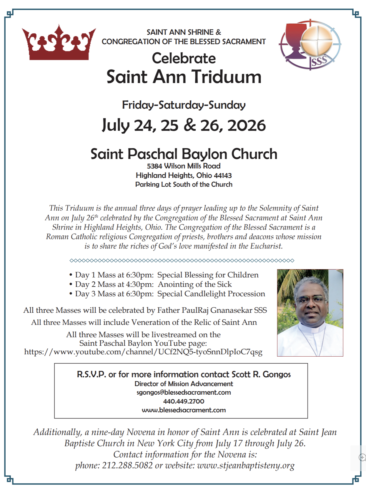 The Triduum is the annual three days of prayer leading up to the Solemnity of Saint Ann on July 26th celebrated by the Congregation of the Blessed Sacrament at Saint Ann Shrine in Highland Heights, Ohio. The Congregation of the Blessed Sacrament is a Roman Catholic religious Congregation of priests, brothers and deacons whose mission is to share the riches of God’s love manifested in the Eucharist.