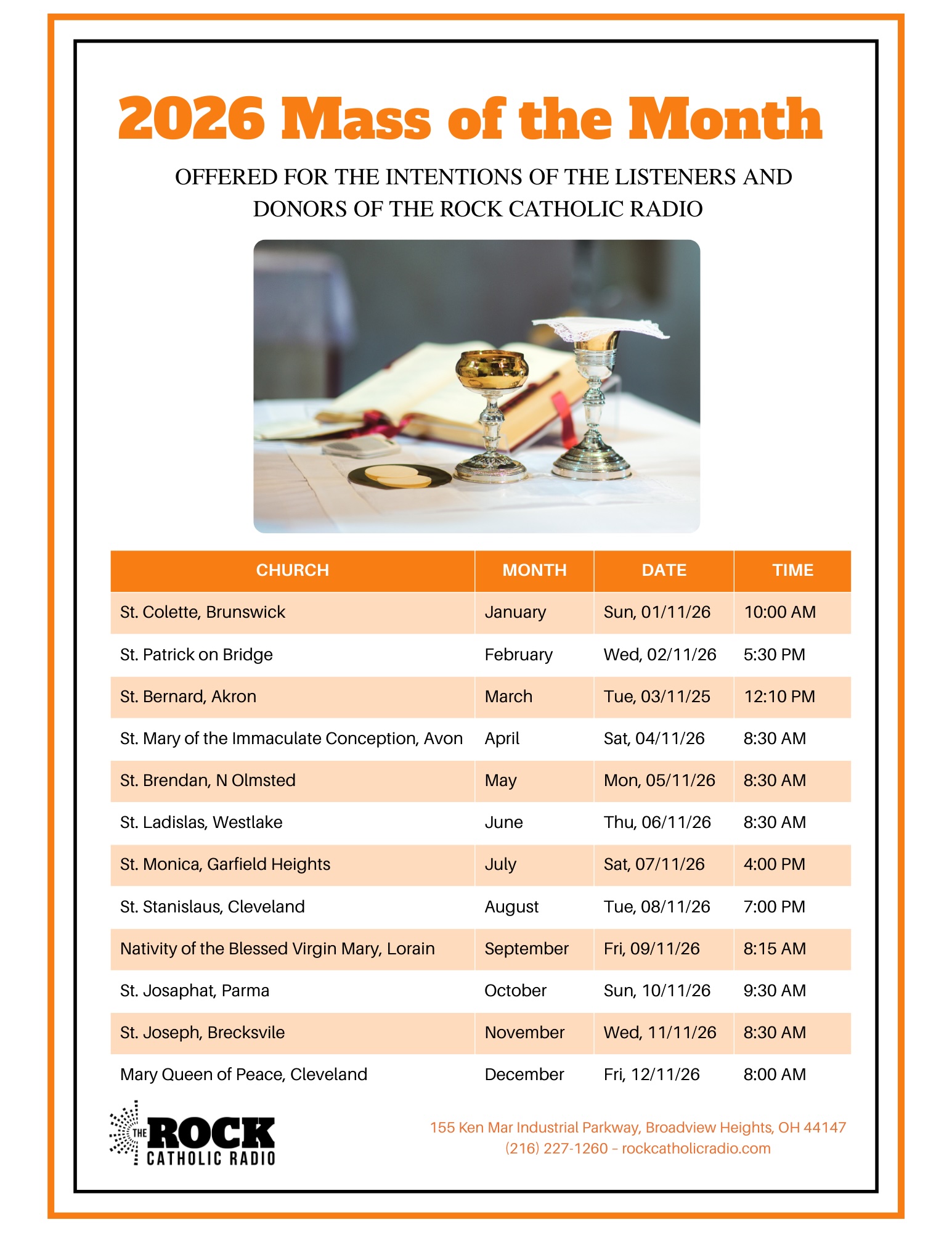 Each month, Mass is offered for the intentions of the listeners and donors of The Rock Catholic Radio. You are welcome to attend any of the Masses as listed on the flyer. Thank you!