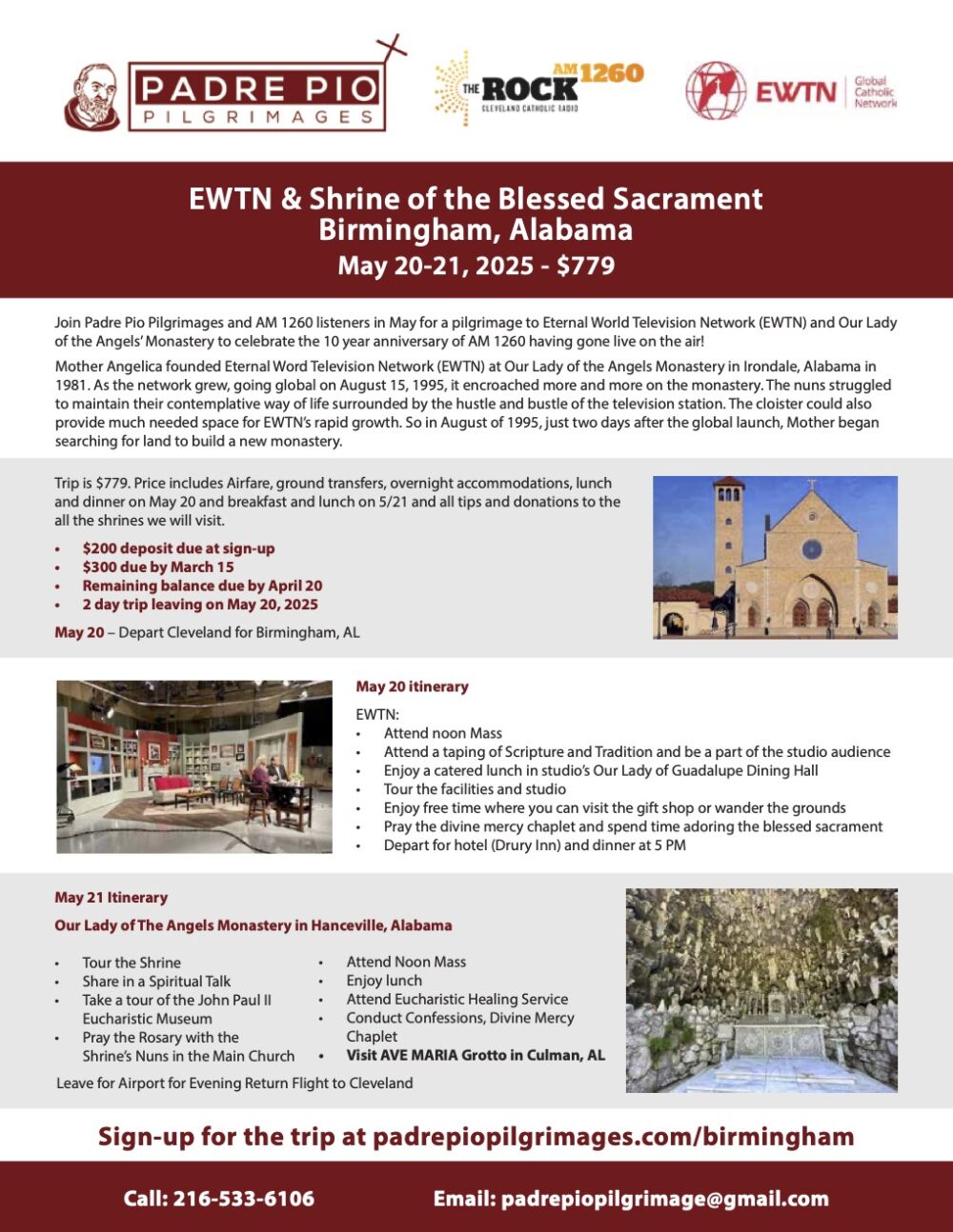 AM1260 Listener pilgrimage to EWTN in Irondale Alabama and Our Lady of the Angels Monastery in Hanceville, Alabama (we are flying no bus).
