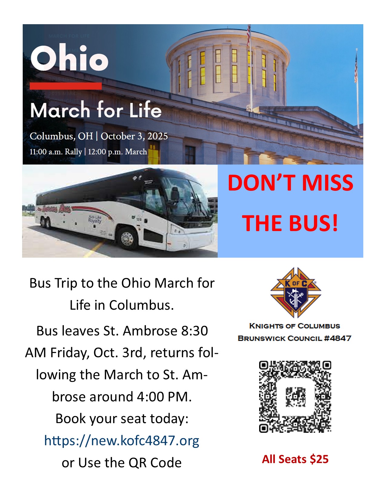 The Brunswick Knights of Columbus are hosting a bus trip to the Ohio March for Life in Columbus, at the State House. Thanks to a generous donor, Seats will be just $25, including box lunch and driver gratuity. The bus leaves St. Ambrose promptly at 8:30 AM to arrive in time for the 11:00 AM Rally and 12:00 PM March. The bus will return to St. Ambrose following the March, approximately 1:30 PM.