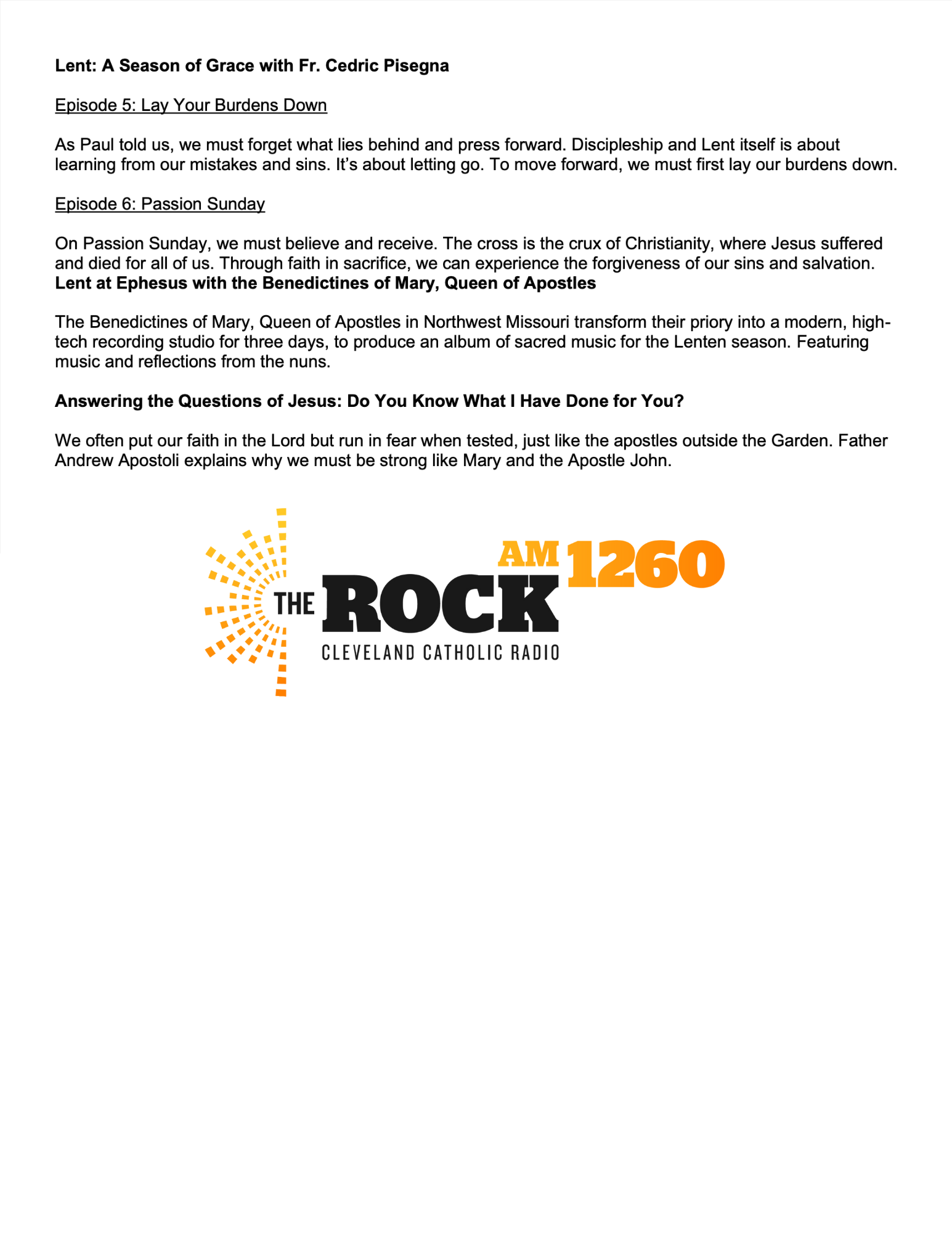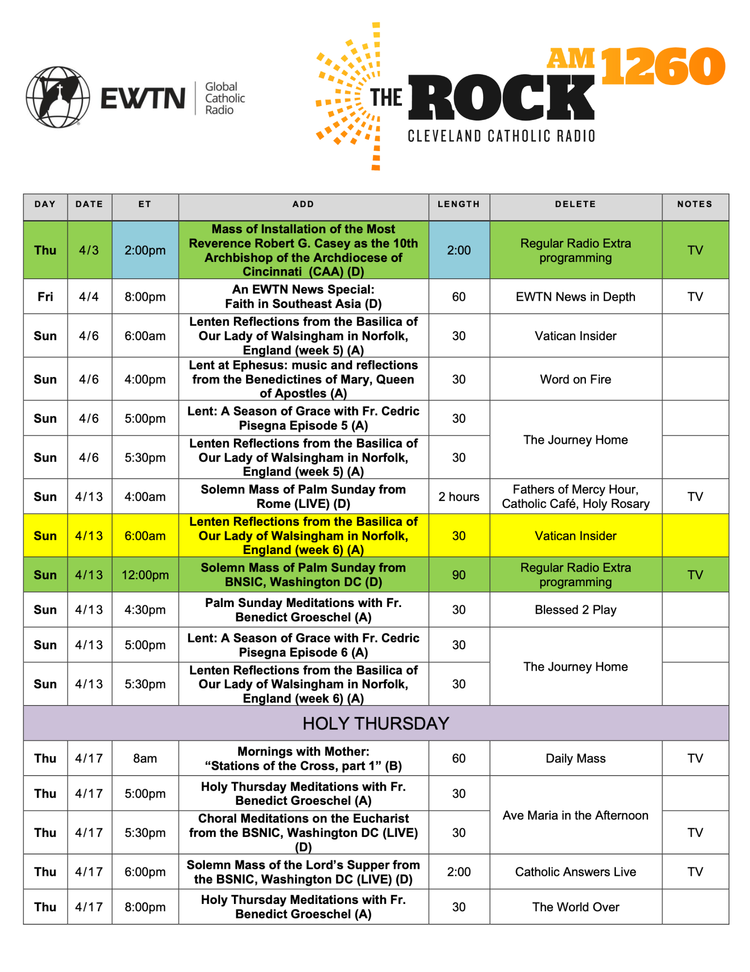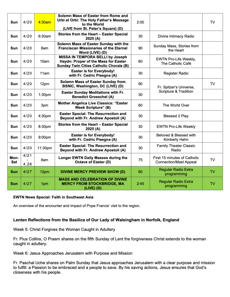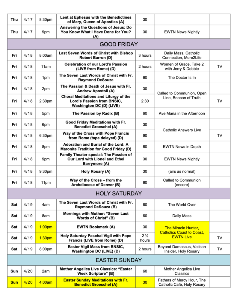 Below are special programming schedules for Holy Week and Easter. There are many special programs scheduled for the holy days. Some of the programs listed are for TV only and are marked as such. You can view them on EWTN.